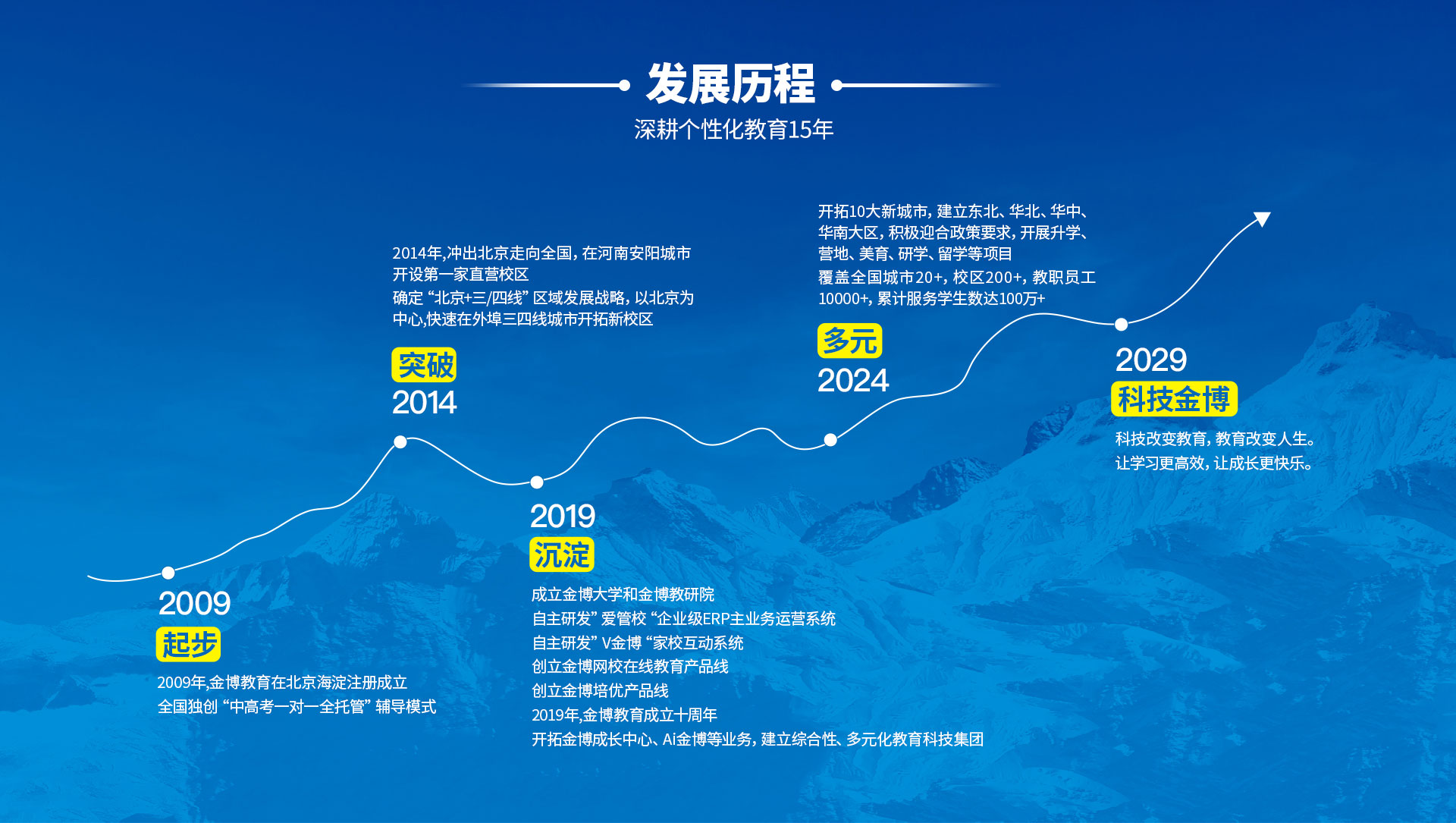 金博教育创立于2009年,核心管理团队汇聚华为资深管理精英与清华大学、北京大学及武汉大学教育专家,是一家集教育咨询、教育产品研发、教育服务为一体,专注于青少年成长的综合性教育科技集团。集团旗下包含金博个性化、金博全日制、金博培优、金博网校、V金博、金博成长中心、AI金博等子品牌。