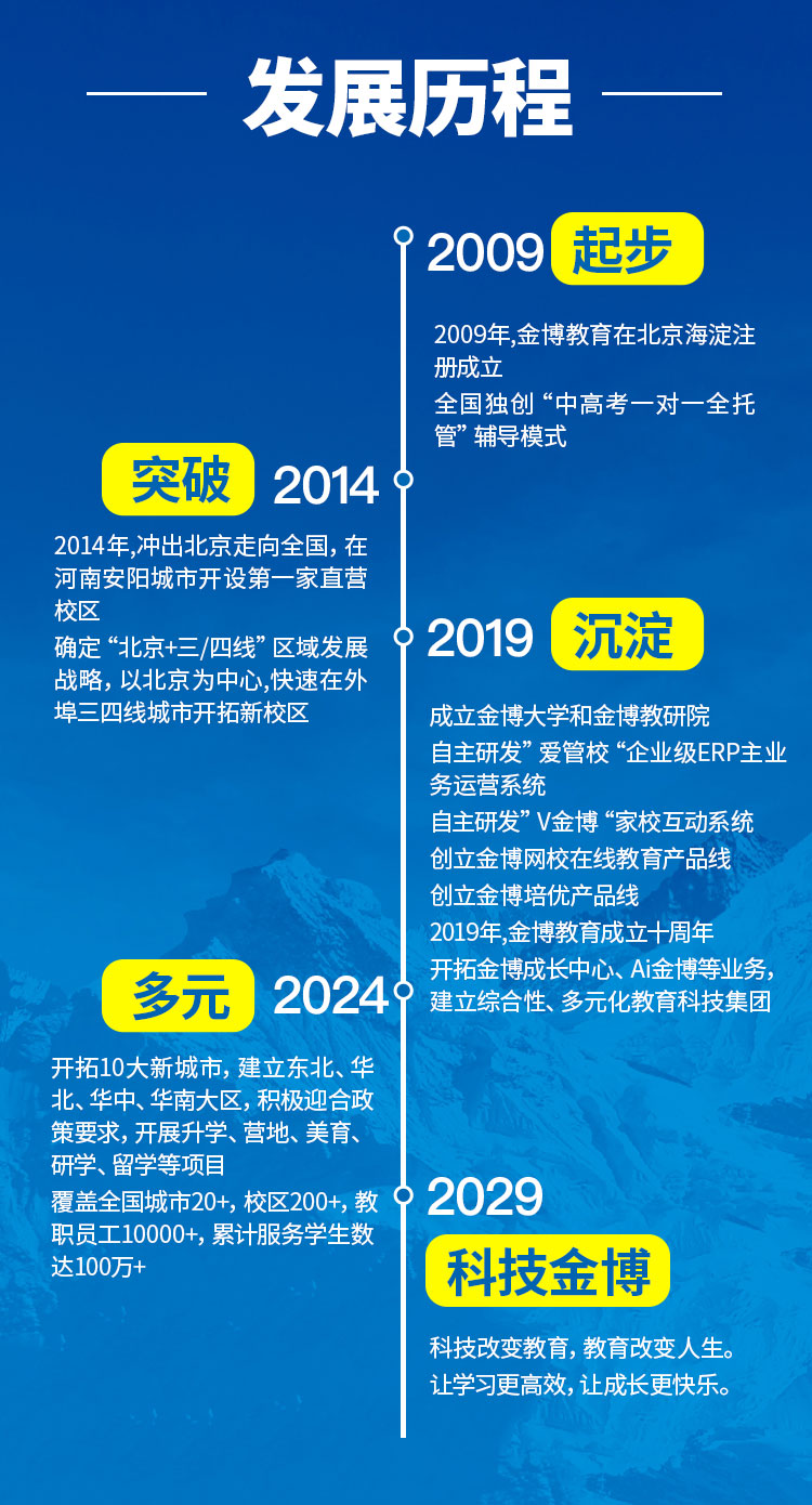 金博教育创立于2009年,核心管理团队汇聚华为资深管理精英与清华大学、北京大学及武汉大学教育专家,是一家集教育咨询、教育产品研发、教育服务为一体,专注于青少年成长的综合性教育科技集团。集团旗下包含金博个性化、金博全日制、金博培优、金博网校、V金博、金博成长中心、AI金博等子品牌。